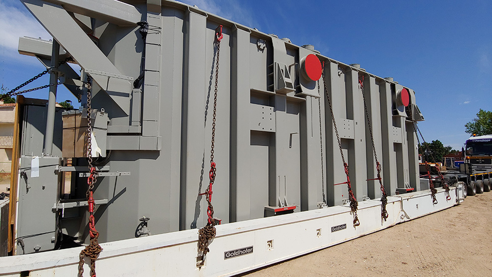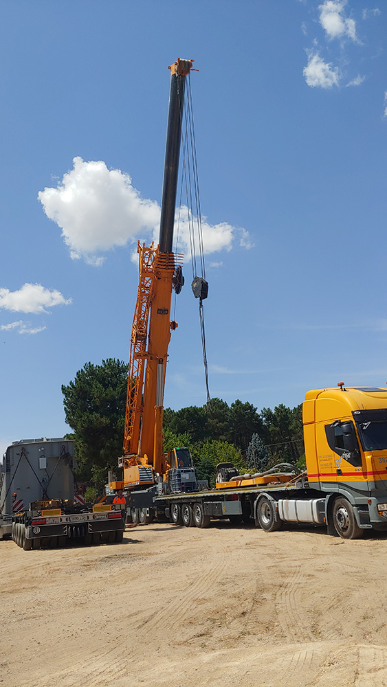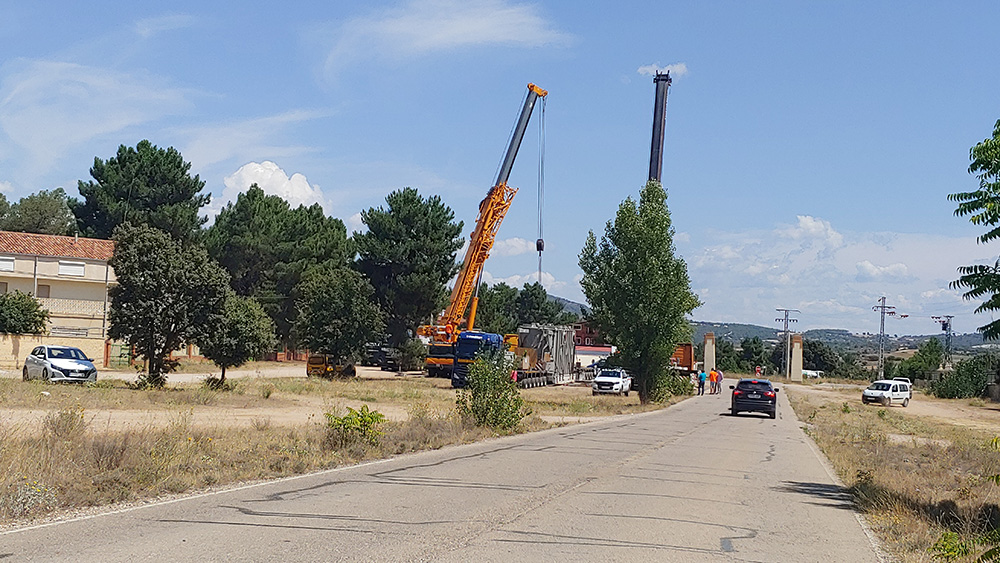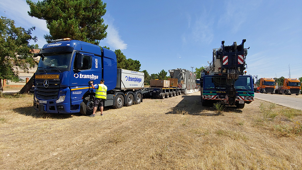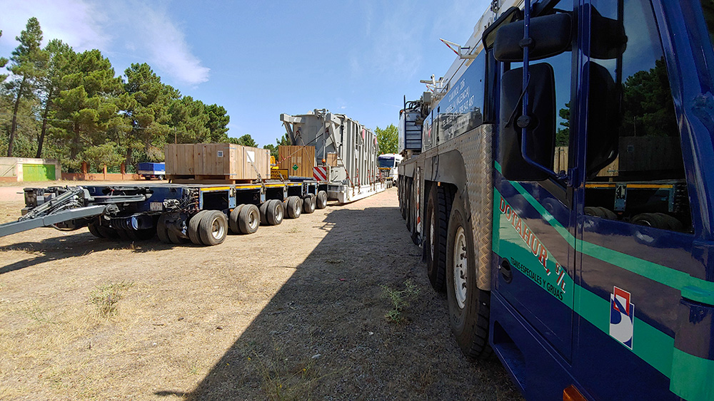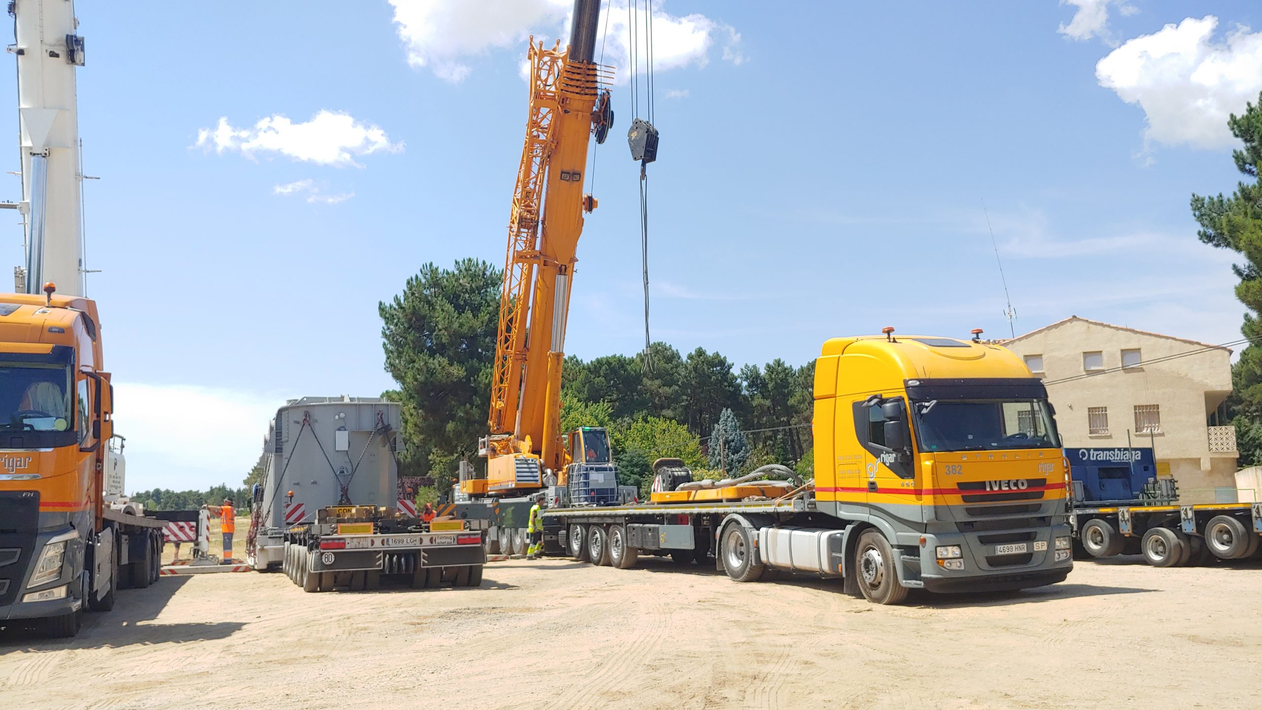 Enorme operativo montado en el Pinar de Jábaga en el que un buen número operarios, camiones de gran tonelaje y dos grandes grúas, intervienen con el fin de cambiar un enorme transformador a otro tipo de góndola, que permitirá transportarlo por la estrecha carretera de Villanueva de los Escuderos ya que, su destino, será cercano a la subestación de la red eléctrica del AVE según el proyecto Complejo Fotovoltaico Altarejos – Villanueva de los Escuderos que comprenderá una planta solar fotovoltaica de 49,98 MWp e infraestructuras de evacuación asociadas, 10 estaciones de potencia, red subterránea de media tensión (RSMT), 30 kV simple circuito, formada por 4 circuitos, subestación eléctrica transformadora 132/30 kV (“Complejo FV Altarejos”) y línea aérea de alta tensión, 132 kV simple circuito, de conexión con la subestación transformadora 132/400 kV “Villanueva de los Escuderos Renovables .