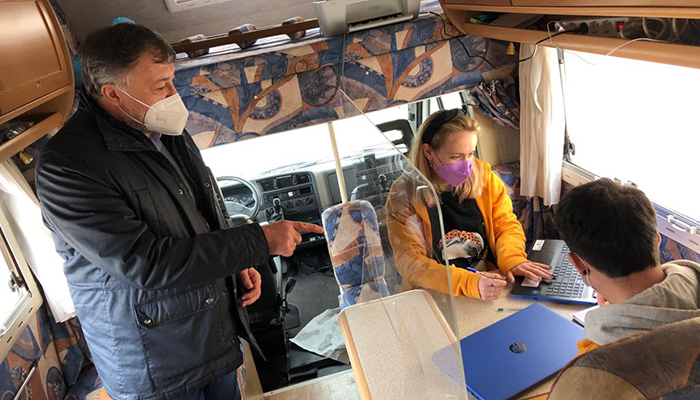 El alcalde, Darío Dolz, y las concejalas de Servicios Sociales y Participación Ciudadana, Esther Barrios y Asunción Moriana, han visitado hoy uno de los dos vehículos que desde el día 1 de febrero prestan este servicio a barrios y pedanías, asistiendo a los vecinos y vecinas de Cuenca que tienen dificultades para realizar sus trámites a través de Internet. En concreto, se han desplazado al Cerro de la Horca.