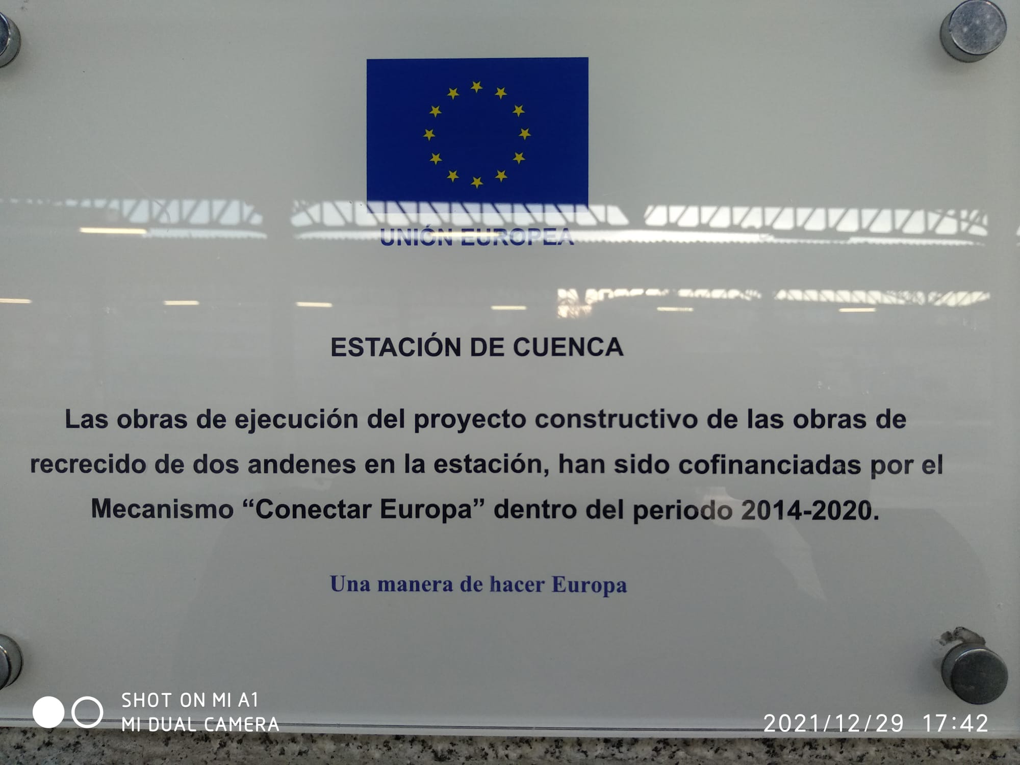 En un lugar de la estación de ferrocarril de la ciudad de Cuenca, hay una placa en la pared con el escudo de la Unión Europea, en la que se puede leer lo siguiente: “Las obras de ejecución del proyecto constructivo de las obras de recrecido de dos andenes de la estación, han sido financiadas por el Mecanismo “Conectar Europa” dentro del periodo 2014-2020. Debajo del texto figuraba a modo de eslogan: “Una manera de hacer Europa”.