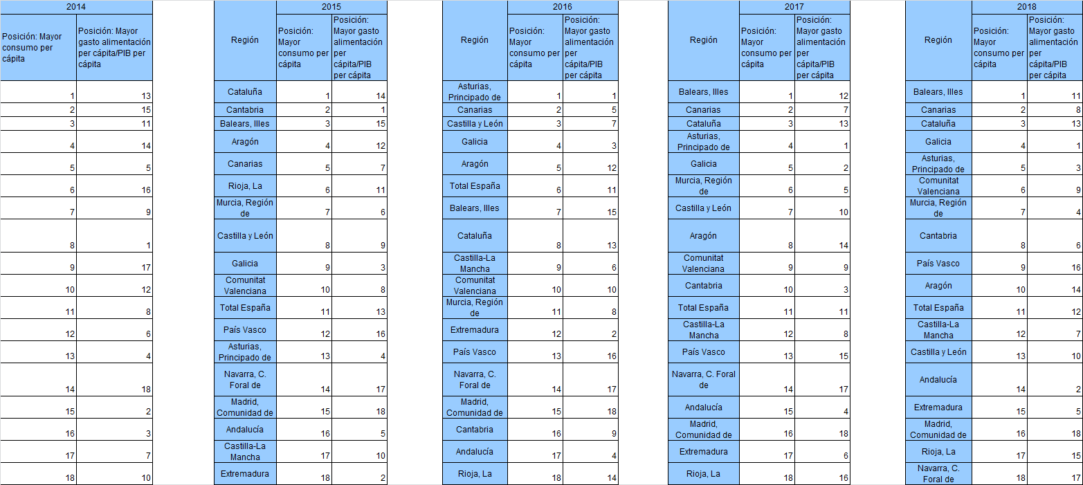 Al comparar las posiciones de los 28 países de la UE en cuanto al gasto nominal en alimentación y PIB nominal por habitante, España, de 2014 a 2017, se encontraría en el puesto 16 de los 28 países con el gasto en alimentación por habitante por habitante; mientras que respecto al PIB, se encuentra en el puesto 13 de los 28.