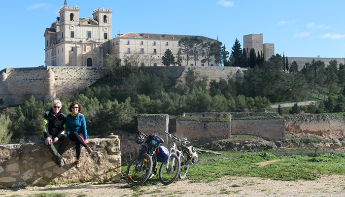 Y tras esta visita de nuevo Muñoz y Rubio se montan en sus bicicletas para acercarnos hasta el espectacular Monasterio de Uclés, denominado “El Escorial de La Mancha”. Desde el cerro donde se puede ver toda la monumentalidad de este edificio y el castillo, nos cuentan las conquistas y reconquistas que tuvo esta localidad y se detienen en la batalla de Uclés o de los 7 condes, librada en el año 1108 entre las tropas cristianas de Alfonso VI y las almorávides. Esta batalla fue un completo desastre para los cristianos que tuvieron más de 3000 muertos, entre ellos el príncipe, Sancho Alfónsez, el único hijo varón del rey y el heredero del trono de León. Sus consecuencias cambiaron la historia de la Península Ibérica y propició, de algún modo, el nacimiento de Portugal.