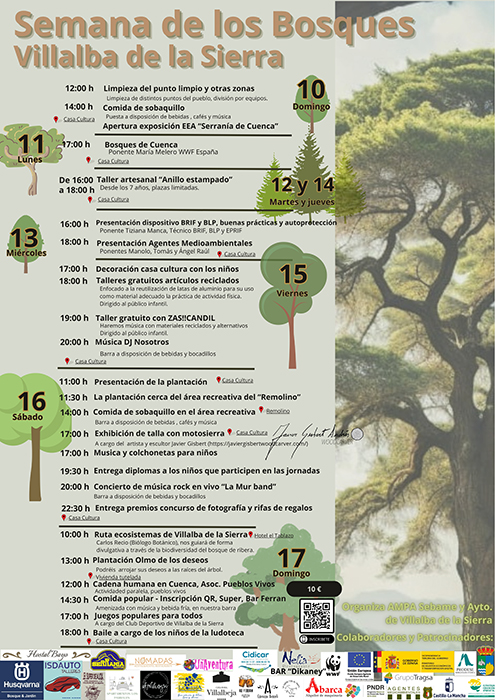 Villalba de la Sierra organiza la tercera edición de su Semana de los BosquesPara mejorar el estado de los bosques en el entorno más inmediato a Villalba, se han programado tanto la limpieza de basura en distintos puntos del pueblo como la plantación de árboles y arbustos autóctonos. Durante toda la semana se contará con la exposición “Serranía de Cuenca”, a través de la Estrategia de Educación ambiental de Castilla-La Mancha, que trata sobre los principales valores ambientales de este Parque Natural y constituye un recorrido por su geología, flora y fauna. La parte didáctica del programa se completa con una charla sobre los Bosques de Cuenca y una ruta interpretada por la senda local del Caz. Diferentes talleres y juegos dirigidos al público más infantil, una exhibición de talla con motosierra, un concurso fotográfico y un concierto de música completan una semana rebosante de actividades.