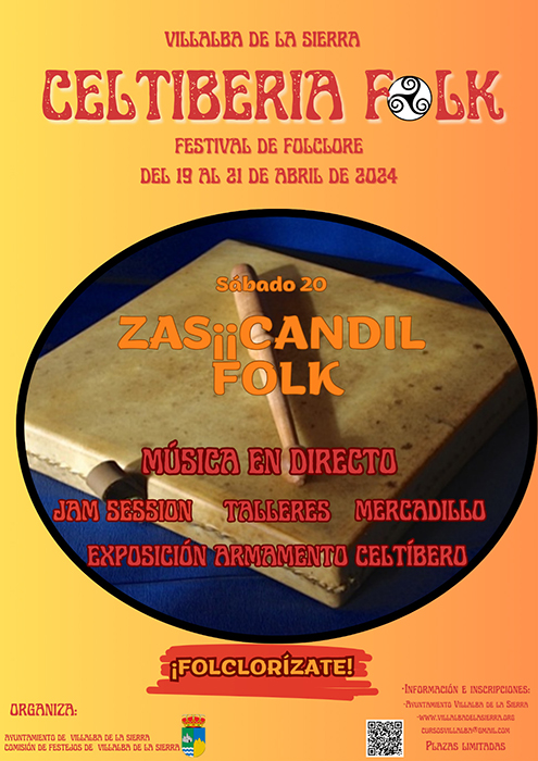 El sabado tarde se iniciará con la muestra de folclore trabajado en los talleres realizados por Javi Collado en el municipio con niños/as, mujeres y personas mayores, así como las muestras de las diferentes agrupaciones participantes. El plato fuerte comenzará a las 22:00h con una actuación de humor celtíbero y el concierto posterior del afamado grupo de folk conquense»ZAS¡¡CANDIL FOLK», para terminar con una fiesta postconcierto. Todo en la Casa de la Cultura.