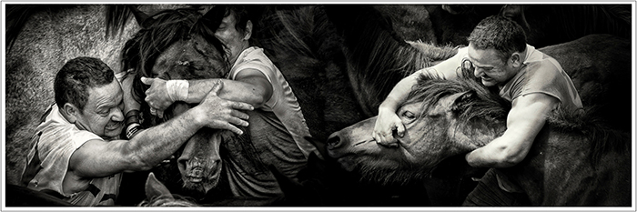 Las fotografías premiadas están compuestas en una especie de dípticos, en blanco y negro y en un original formato alargado 3:1, mostrando escenas de la Rapa en varios planos, tomadas algunas de ellas desde dentro del propio “curro”, una actividad que conlleva un indudable riesgo al encontrarse el fotógrafo literalmente rodeado por dos centenares de caballos salvajes con reacciones altamente imprevisibles.