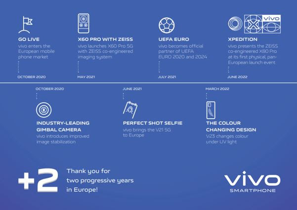 En 2022, vivo ha alcanzado varios hitos tecnológicos como el lanzamiento de un smartphone que cambia de color en la serie V, el vivo V23 en su versión “Sunshine Gold”, impulsando la fotografía móvil profesional con la serie X y manteniendo su colaboración con ZEISS, así como las colaboraciones deportivas con LaLiga, la UEFA EURO 2020 y 2024, y la FIFA World Cup Qatar 2022TM.