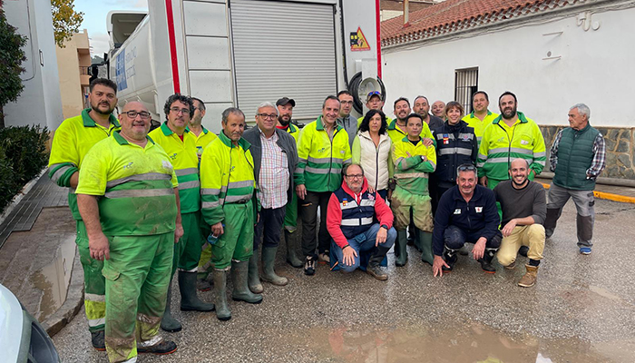 Voluntarios de FCC, concesionaria del Servicio de Limpieza del Ayuntamiento de Cuenca, continúan ayudando en las labores de limpieza de calles en Mira, hasta donde se han desplazado en los últimos días con vehículos y material municipal como sopladores, palas y cepillos de barrendero, coordinando su trabajo con la alcaldesa del municipio, Miriam Lava.