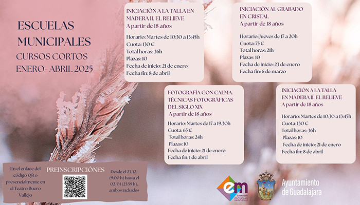 Las Escuelas Municipales del Ayuntamiento de Guadalajara preparan una nueva oferta formativa a desarrollar en los meses de enero, febrero y marzo del próximo 2025.