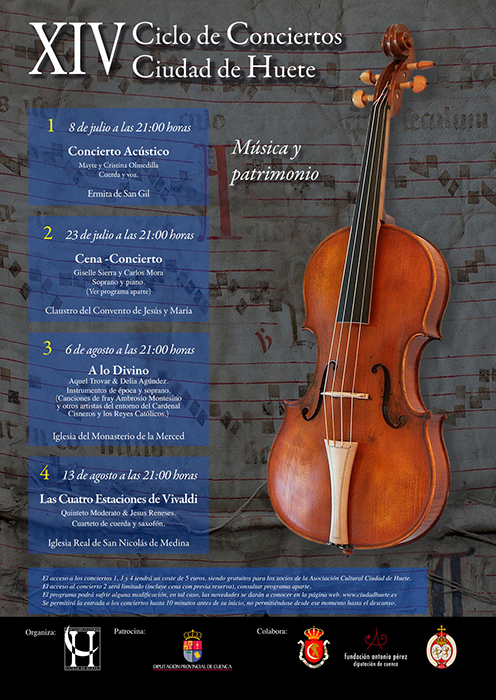XIV Ciclo de Conciertos Ciudad de Huete, «Música y Patrimonio»La Asociación Cultural Ciudad de Huete presenta para este verano 2022 su XIV Ciclo de Conciertos Ciudad de Huete «Música y Patrimonio» con un total de 4 conciertos en los meses de julio y agosto.