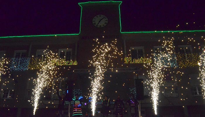 Tras esta proyección, unos espectaculares bailarines robóticos, llenos de luces de colores, han animado la fiesta con su espectáculo de LEDs de fantasía. Al tiempo se iba creando la máxima expectación para que con una vistosa cuenta atrás se llegara al clímax del encendido de toda la iluminación ornamental que se ha dispuesto en la Plaza del Pueblo, y que este año es muy espectacular. Un pequeño castillo de fuegos artificiales lanzado desde la azotea del Ayuntamiento ha puesto punto final a un evento en el que también se ha ido proyectando un vídeo con los actos de Navidad programados para todos estos días.